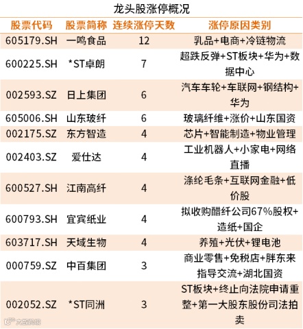 涨停的股票中,一鸣食品连续12天涨停,公司涉及的概念为乳品+电商+冷链物流。*ST卓朗紧随其后,公司连续7天涨停,所属概念为超跌反弹+ST板块+华为+数据中心。日上集团涨停天数为6天,公司属于汽车车轮+车联网+钢结构+华为概念。山东玻纤、东方智造、爱仕达等个股携手涨停,以上个股引领市场上行。