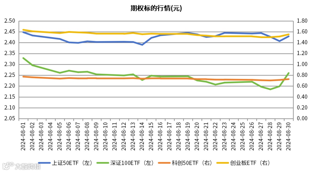 波动率方面,随着8月市场行情和期权标的震荡下跌走势,除科创50ETF的波动率小幅上升,各标的的波动率均呈现小幅下降趋势,历史波动率与隐含波动率趋势一致,隐含波动率与历史波动率基差较月初加大。