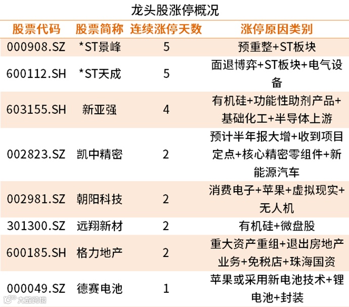 涨停的股票中,*ST景峰连续5天涨停,公司涉及的概念为预重整+ST板块。*ST天成紧随其后,公司连续5天涨停,所属概念为面退博弈+ST板块+电气设备。新亚强涨停天数为4天,公司属于有机硅+功能性助剂产品+基础化工+半导体上游概念。凯中精密、朝阳科技、远翔新材等个股携手涨停,以上个股引领市场上行。