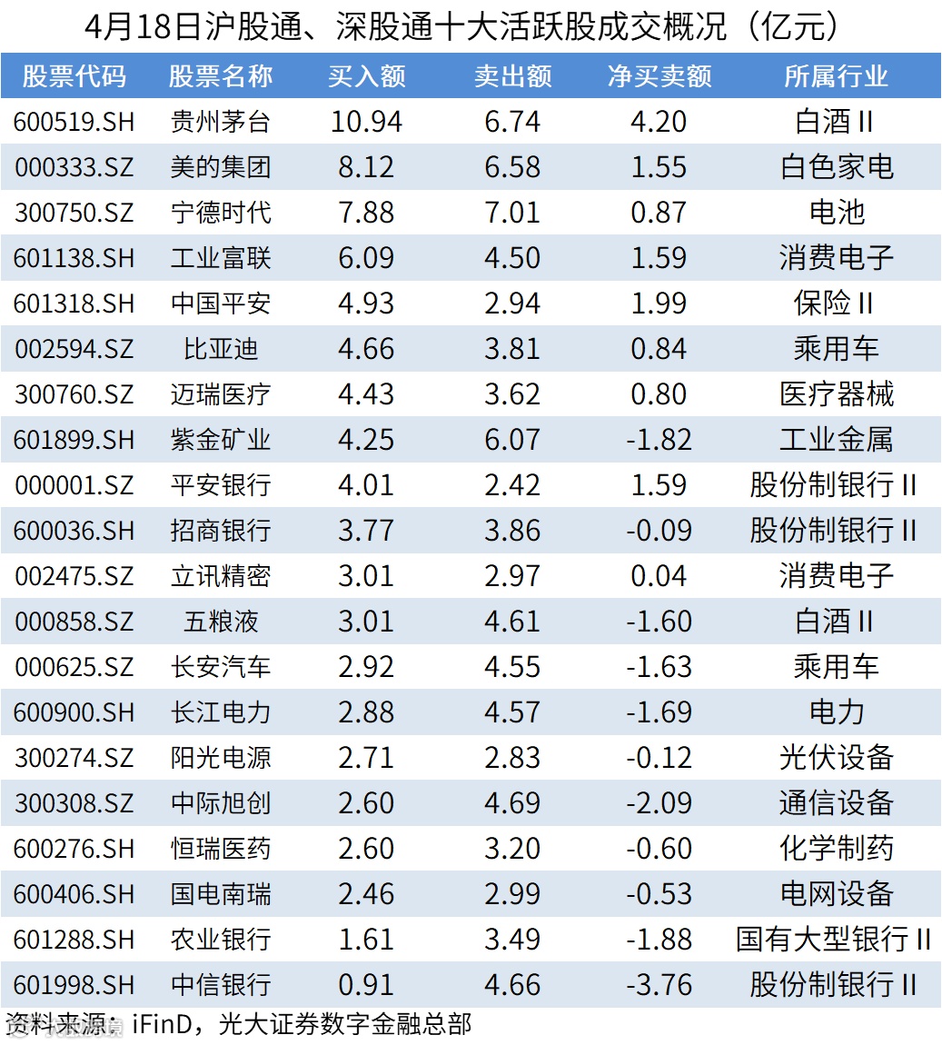 1、4月18日,北向资金大幅净卖出52.85亿元,连续3日减仓。中信银行、中际旭创、农业银行分别遭净卖出3.76亿元、2.09亿元、1.88亿元。贵州茅台净买入额居首,金额为4.2亿元。南向资金当天净买入66.38亿港元。