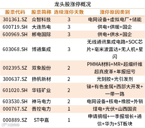 涨停的股票中,众智科技连续3天涨停,公司涉及的概念为电网设备+虚拟电厂+储能。大连热电紧随其后,公司连续3天涨停,所属概念为供电+供暖+国企。郴电国际涨停天数为3天,公司属于供电+供水+国企概念。博通集成、双象股份、扬帆新材等个股携手涨停,以上个股引领市场上行。