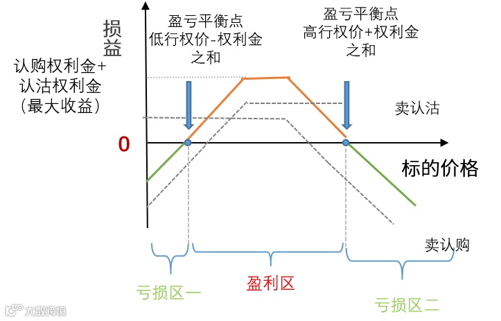 顾名思义,双卖策略是一种卖出两种期权合约的组合,即相同标的、相同到期日、相同数量的认购和认沽合约。如果两种合约的行权价相同,即为卖出跨式策略;如果认购合约的行权价高于认沽期权,即为卖出宽跨式策略。当隐含波动率预期上涨的概率不大,行情保持区间震荡时,组合整体有权利金收益。