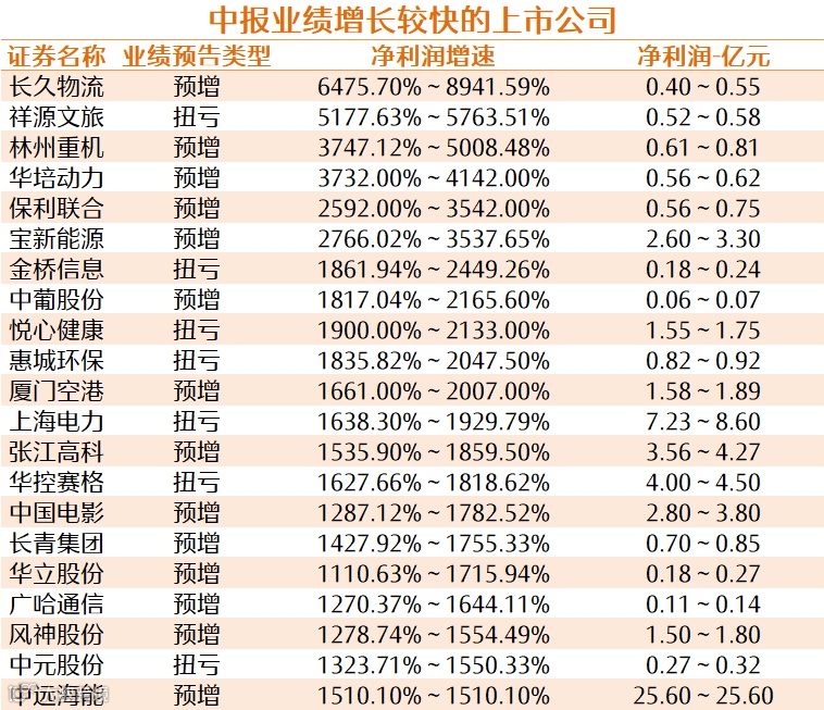 11家公司业绩有望实现20倍以上增长,包括:长久物流、祥源文旅、林州重机、华培动力、保利联合、宝新能源、金桥信息、中葡股份、悦心健康、惠城环保、厦门空港。