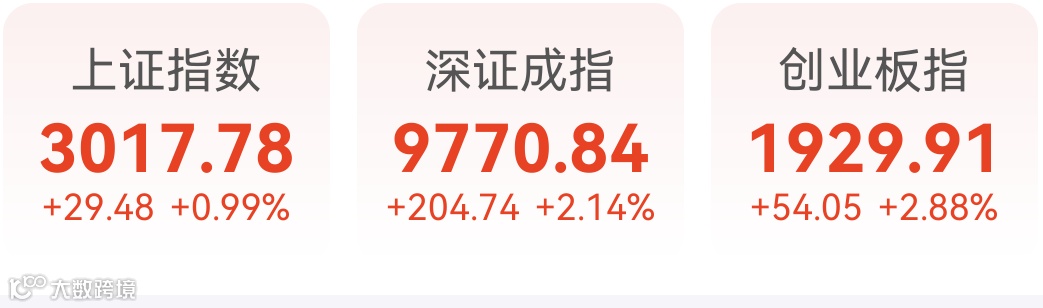 10月27日,三大指数大幅放量反弹,沪指午后涨超1%,重返3000点上方,深成指涨超2%,创业板指盘中大涨超3%。两市成交9644亿元,较上个交易日放量1219亿。涨多跌少,两市超3900股飘红。截止收盘沪指涨0.99%,深成指涨2.14%,创业板指涨2.88%。