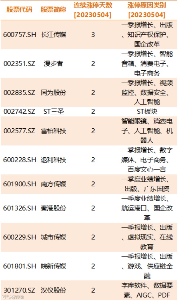 涨停的股票中,长江传媒连续3天涨停,公司涉及的概念为一季报增长、出版、知识产权保护、国企改革。漫步者紧随其后,公司连续2天涨停,所属概念为一季报增长、智能音箱、消费电子、电子商务。同为股份涨停天数为2天,公司属于一季报增长、视频监控、数据安全、人工智能概念。ST三圣、雷柏科技等个股携手涨停,以上个股引领市场上行。