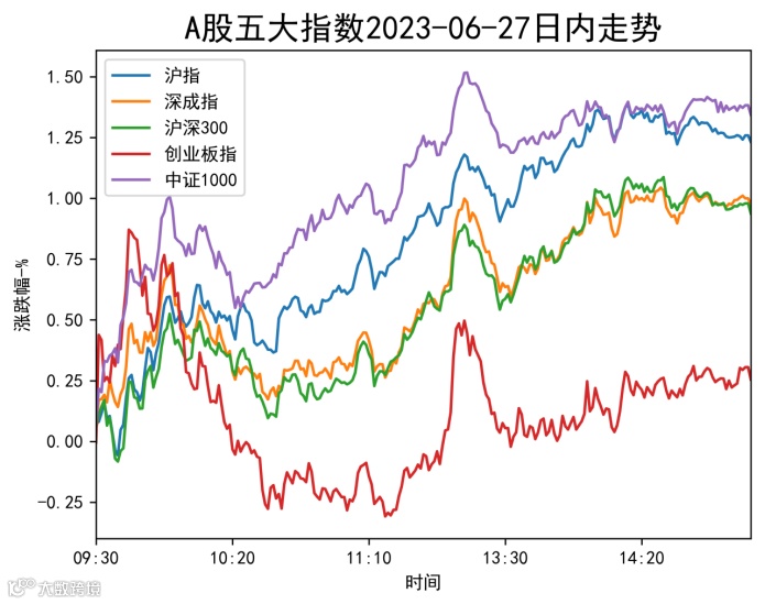 6月27日上证综指涨跌幅为1.23%,收盘价为3189.44点, 成交额为3544.88亿元。深证成指涨跌幅为0.97%,收盘价为10978.08点,成交额为4865.76亿元。两市成交额为8410.64亿元,较上个交易日变动幅度为-13.94%。沪深300涨跌幅为0.94%,创业板指涨跌幅为0.25%,中证1000涨跌幅为1.34%。