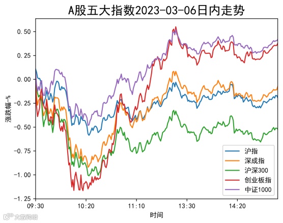 2023.3.6,大盘全天震荡分化,沪指小幅调整,收跌3322点。上证50指数跌超1%,创业板和科创50指数小幅上涨。总体上个股跌多涨少,两市超2400只个股下跌。沪深两市成交额9509亿,较上个交易日放量814亿。