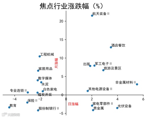 板块方面,表现相对强势行业指数:非金属材料Ⅱ(5.51%)表现较好,光伏设备(3.98%)、酒店餐饮(3.49%)、旅游及景区(2.90%)、军工电子Ⅱ(2.21%)等行业紧随其后。