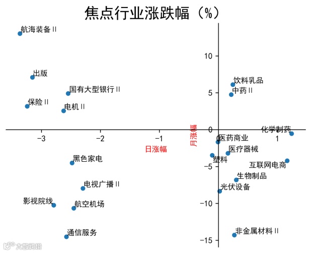 板块方面,表现相对强势行业指数:化学制药(1.24%)表现较好,互联网电商(1.17%)、生物制品(0.30%)、非金属材料Ⅱ(0.27%)、饮料乳品(0.25%)等行业紧随其后。