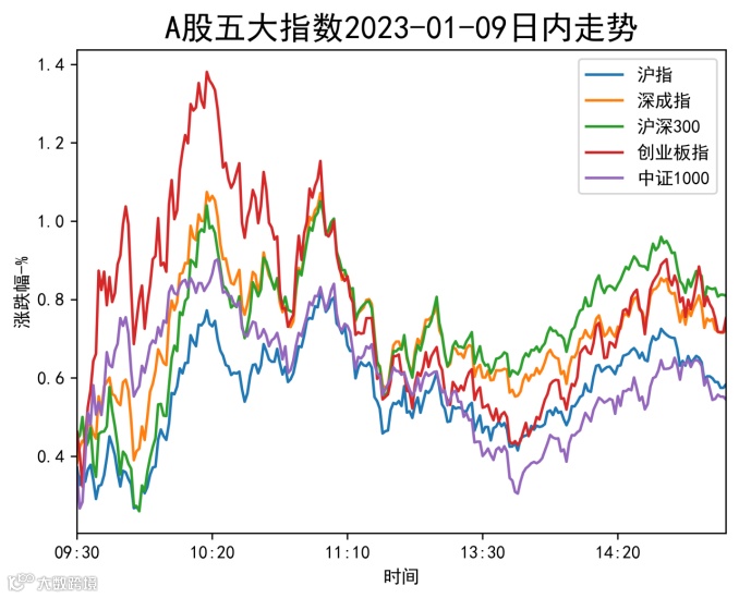 2023.1.9,大盘高开后冲高震荡,三大指数均小幅上涨,沪指录得六连阳。上证50指数领涨,涨幅超1%,主要指数中仅科创50指数小幅下跌。总体上个股涨多跌少,两市超2800只个股上涨。沪深两市成交额8072亿,较上个交易日缩量308亿。