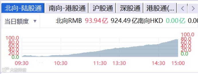 北向资金全天净买入93.94亿元,又回到百亿规模。沪股通净买入56.91亿元,深股通净买入37.03亿元。北向资金本月累计净买入超1000亿元,再创历史记录,超去年全年,同时也超过2014年、2015年、2016年的全年净买入总额。