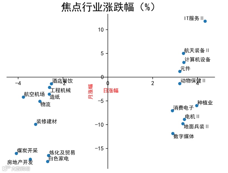 板块方面,表现相对强势行业指数:IT服务Ⅱ(4.34%)表现较好,种植业(3.97%)、电机Ⅱ(3.42%)、计算机设备(3.39%)、航天装备Ⅱ(3.37%)等行业紧随其后。