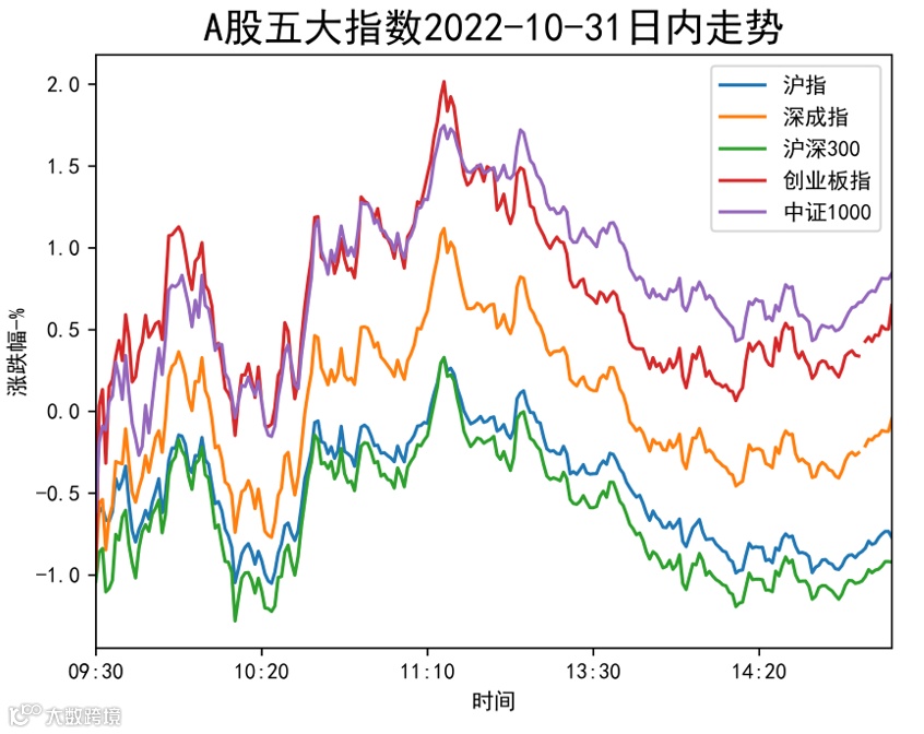 2022.10.31,三大指数低开高走,午后震荡回落。沪指失守2900点,盘中最低2885点,一度逼近4.27日前期低点2863点。创业板指震荡小幅反弹,科创50指数一骑绝尘,逆势大涨1.67%。两市总体上个股涨多跌少,超3200只个股上涨。沪深两市今日成交额8832亿,较上个交易日缩量265亿。