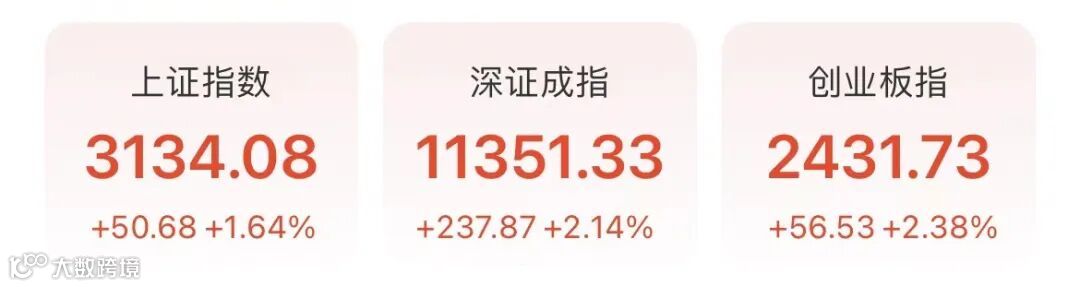 11月15日,三大指数全天低开高走,沪指重返3100点上方,深成指、创业板指午后均涨超2%。个股呈现普涨态势,两市近4200股飘红,成交连续第三个交易日破万亿。截止收盘沪指涨1.64%,深成指涨2.14%,创业板指涨2.38%。
