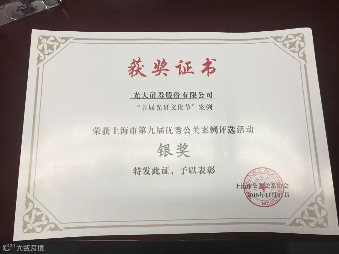 两年一届的上海市优秀公关案例评选是全国公共关系领域最具权威性的专业评选活动之一。此次公司报送的“首届光证文化节”案例紧扣创新主题,传播优秀的企业文化,从近200个报送案例中脱颖而出,最终获得银奖,对树立光大证券企业形象具有良好的社会效应。