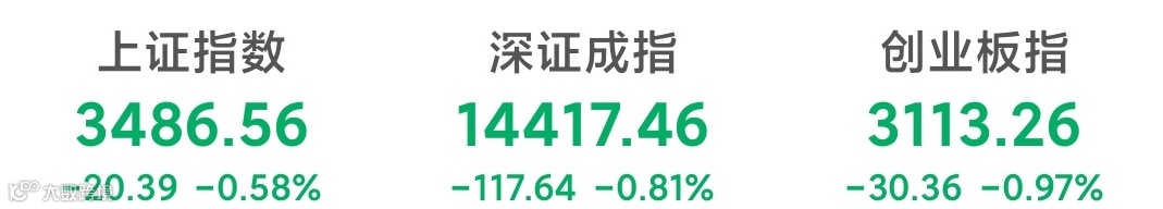 上周五,三大指数全天高开低走,题材局部活跃,个股跌涨跌持平。截至收盘,沪指收报3486.56点,跌幅0.58%;深成指收报14417.46点,跌幅0.81%;创业板指收报3113.26点,跌幅0.97%。