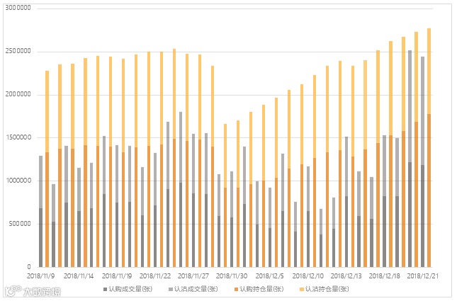本周期权认购合约悉数下跌,12月和19年1月到期的多个合约跌幅超50%;认沽合约悉数上涨,各个到期月份的虚值认沽合约涨幅均超过100%。