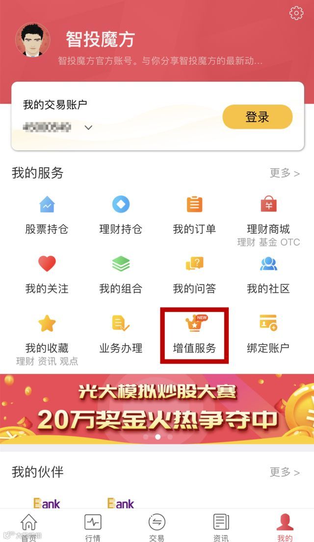 ①点击首页右下角「我的」栏目,进入“我的”页面,点击「增值服务」图标即可进入增值服务页面