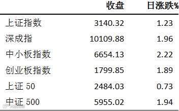 沪指日K线收中阳线,两连阳,收盘点一举站上了近一个月新高,均线系统看,指数站上所有短期均线之上,且均线系统开始转向上行,但也将面临3150第一个压制位,美中不足的是成交量还未有效放大。深成指日K线收中阳线,四连阳,四天累计涨幅3.85%,站稳短期均线,均线系统开始指向上行。