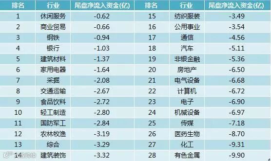 尾盘资金净流出,其中,有色金属、化工和医药生物尾盘资金净流出最多,分别为9.90亿元、9.31亿元和8.70亿元。
