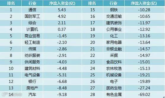 呈现资金净流入,其中:通信净流入最多,为5.43亿元。资金净流出方面,有色金属、医药生物和电子最多,分别净流出69.02亿元、27.24亿元和19.89亿元。