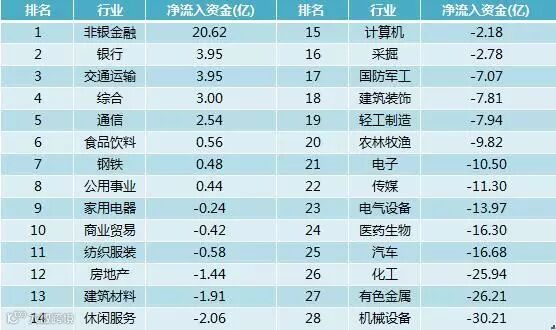呈现资金净流入,其中,非银金融净流入20.62亿元居首。资金净流出方面,机械设备、有色金属和化工最多,分别净流出30.21亿元、26.21亿元和25.94亿元。