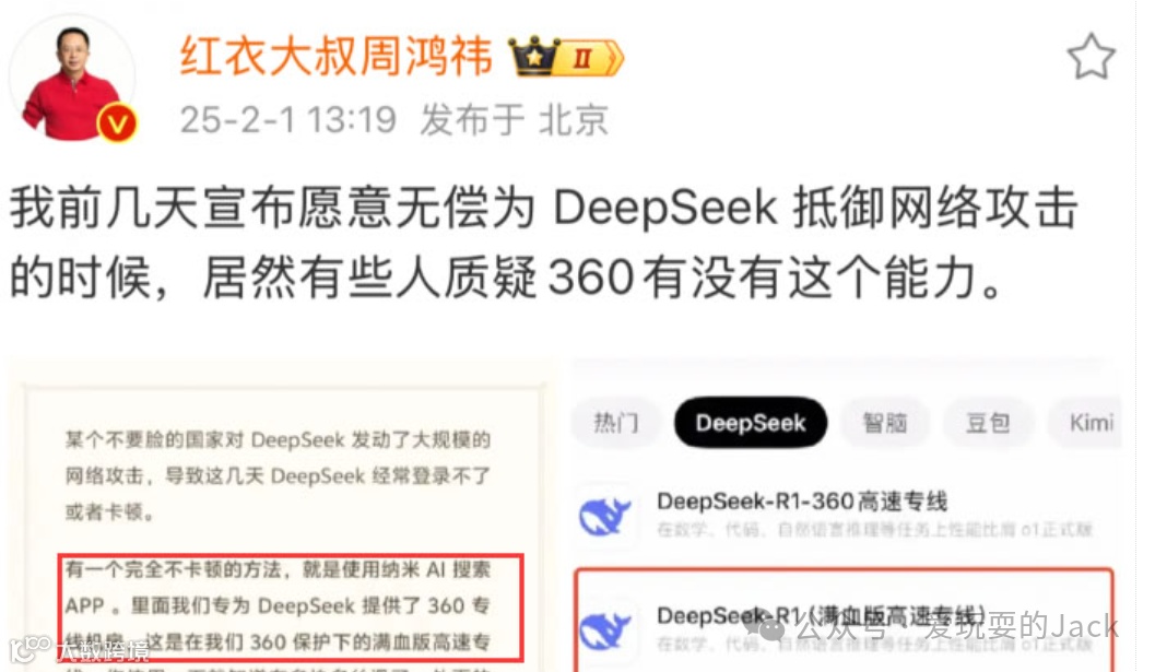 这段时间DeepSeek爆火,自媒体上爆料春节期间DeepSeek遭受美国网络入侵,360、华为、红客联盟等联合击退了入侵,很快恢复了运行。