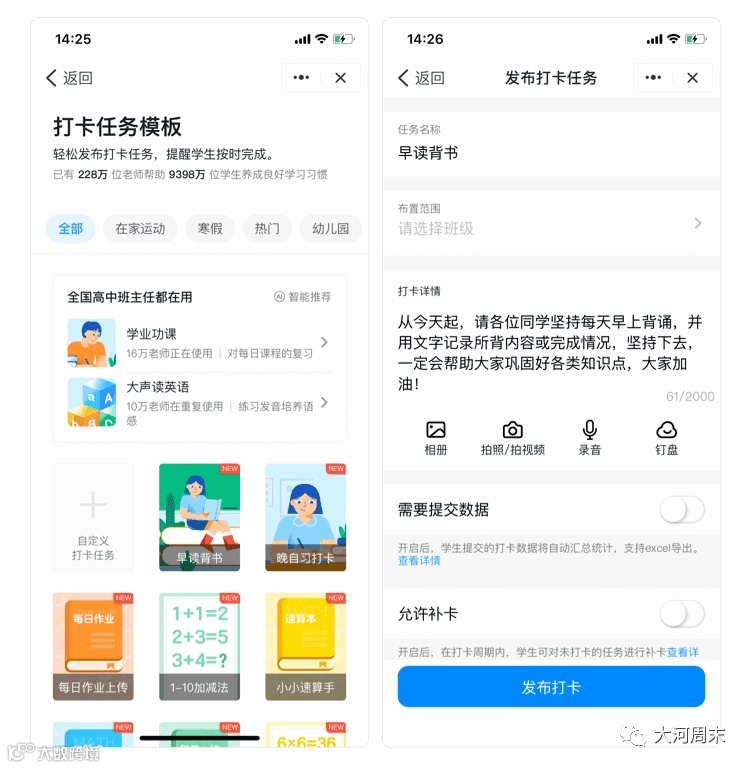老师可以在师生群中发布打卡任务,学生自己打卡,不依赖家长手机,方便老师和学生使用。