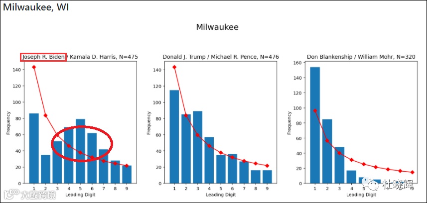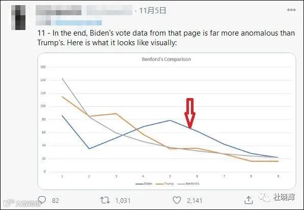 但是推特等社交媒体上开始涌现一种说法:经统计各候选人在某地所有选区的得票数后发现,川普一切正常,而拜登得票不符合“本福特定律”涉嫌舞弊。