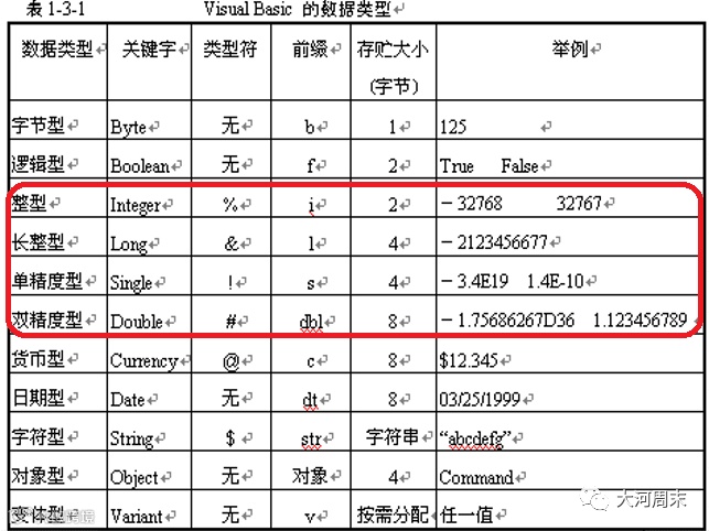 描述数值型数据的数据类型:(整型)Integer、(长整型)Long、(单精度型)Single、(双精度型)Double。区别在于存储范围的大小。