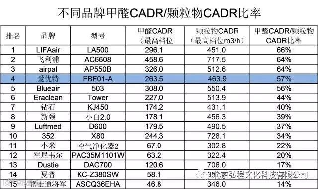 需要指出的是,甲醛CADR与颗粒物CADR,是与产品的风量有着直接联系的。若以“甲醛CADR/颗粒物CADR比率”的方法,可以得知不同品牌处理甲醛能力的强弱,如以下的品牌排名:
