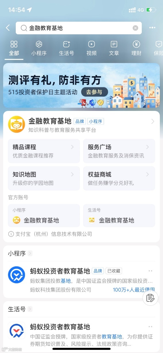 近期,光大证券正式入驻支付宝中的“金融教育基地”(原蚂蚁金融教育基地),为首批入驻该基地的证券公司之一。“金融教育基地”是一个面向消费者的金融消费知识线上服务平台,月活量达150万。光大证券在“金融教育基地”中快速投放各类合规审核后的投教作品,适应短视频时代的受众偏好,扩大影响力,提升光大品牌形象。