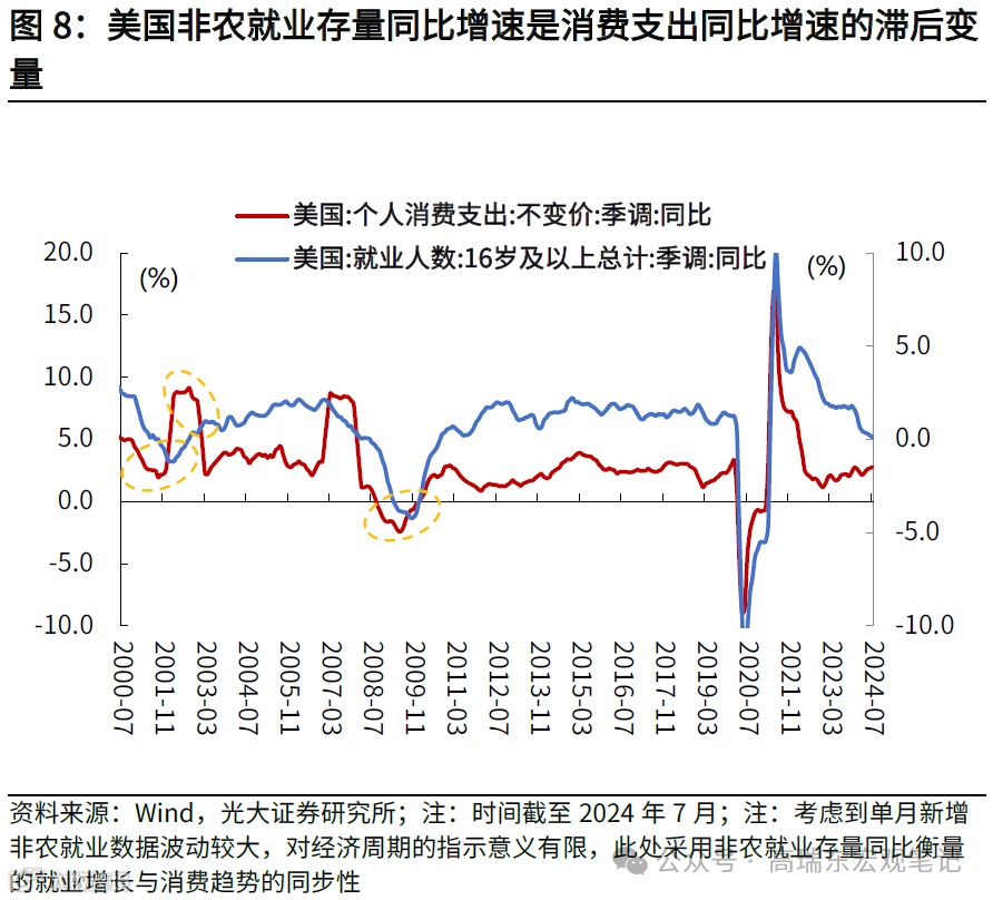 如何理解当前美国经济数据间的“矛盾”?我们认为,从经济循环的周期出发,可以更好理解今年以来美国经济数据的波动。从顺序上讲,消费是美国经济的源头,分别是先行指标(消费等)→同步指标(库存、工业生产、资本支出等)→滞后指标(就业、失业率等)。因此,今年上半年看似矛盾的经济数据(消费和PMI回落,但就业市场维持韧性,失业率长期处在低位)是在逻辑上自洽的,因为高利率环境下的压力仍然主要停留在消费和生产层面,反映在领先和同步指标上,尚未充分蔓延至就业这类滞后指标,直至下半年,就业作为滞后指标开始转弱,失业率逐步攀升,引起市场的衰退担忧。