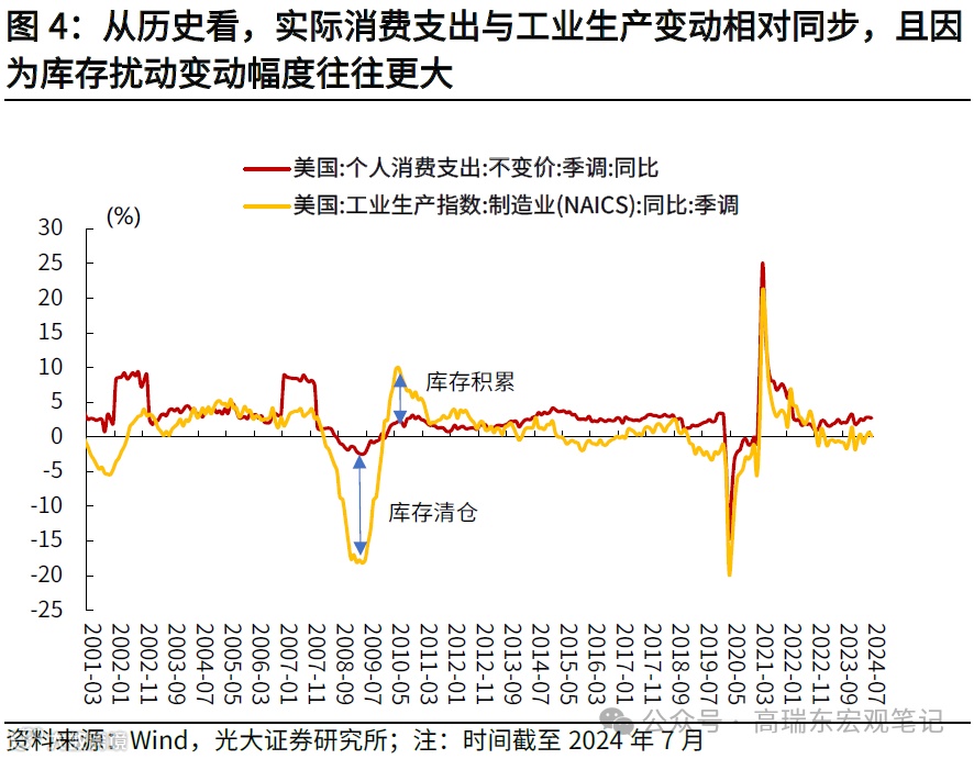 一般而言,消费变化将驱动工业生产的周期性变化,而且与消费相比,由于库存的存在,产出周期的波动更大。例如,消费者的衬衫购买量比前一年同期增长了5%,此时商店的订货量将比前一年增加10%,额外补充库存以满足未来的新需求。相反,当衬衫销售下降时,商店将停止订货并维持原有的库存水平,导致制造商大幅减少产量。可见,消费支出变动伴随着库存的周期性变化,放大了工业生产的波动。从历史上看,工业生产通常与消费支出变动趋势一致。从下图可以看到,美国实际消费支出与工业生产变动基本同步,且因为库存扰动变动幅度往往更大。