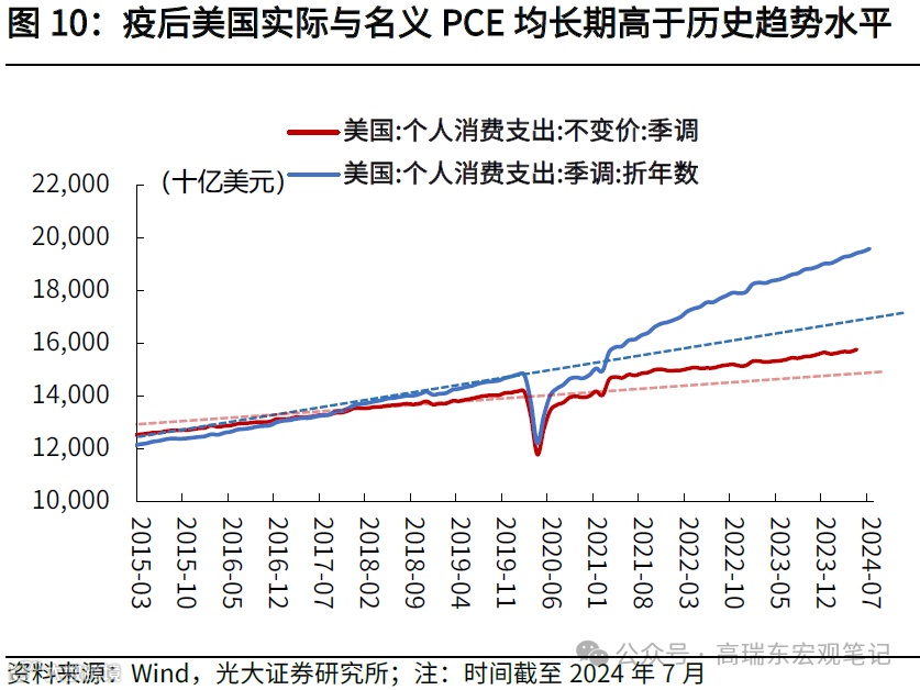 第一,从趋势看,疫后刺激政策仍有“余温”,美国消费仍长期高于疫情前的趋势水平。美国个人消费支出同比增速从2023年1月的7.9%降至2024年7月的5.3%左右,呈现震荡回落的趋势,但仍高于2015-2019年的平均4.0%的增速,显示出当前美国消费的较强韧性。若剔除通胀影响,从实际消费支出看,结论同样类似,7月同比增速为2.7%,高于2015-2019年的平均2.6%的增速。