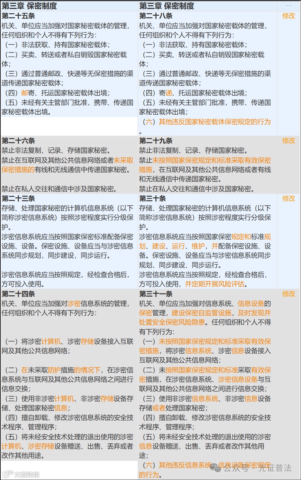 本次修订《保密法》,整体章节体例不变,仍然维持六个章节:从总则、国家秘密的范围和密级、保密制度、监督管理、法律责任、附则六个方面展开,但是对具体条款进行了大量的修订和新增。