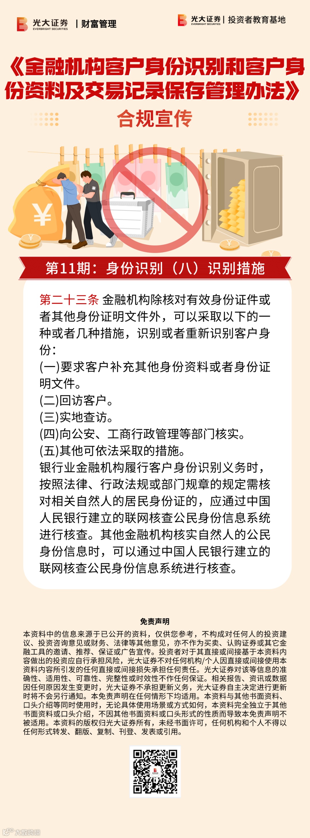 导读:【光大证券投教】合规宣传丨《金融机构客户身份识别和客户身份资料及交易记录保存管理办法》第11期:身份识别(八)识别措施