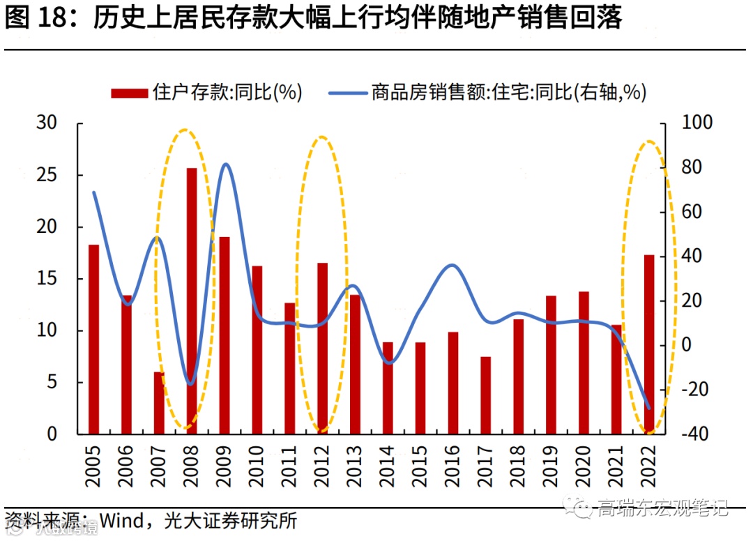 住房作为居民部门资产配置的主体,一直以来都是影响居民储蓄的重要因素,历史上几次居民储蓄高增都处在房地产销售下行期。由于房地产严监管以及信用风险暴露,2021年下半年起,房地产销售增速开始转负,2022年更是处在深度下跌过程中。