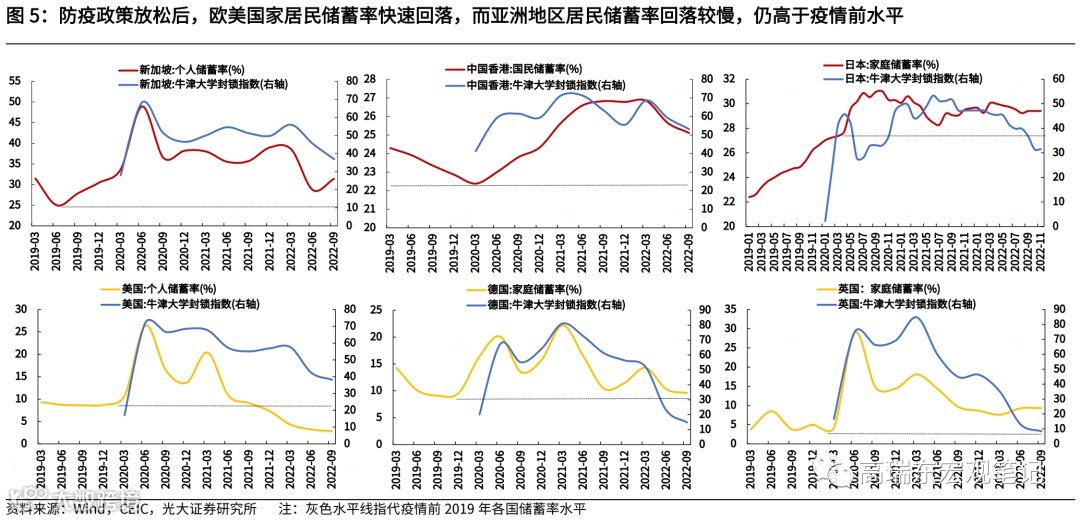 欧美国家储蓄率主要受消费场景约束,预防性储蓄占比较低,因此在防疫政策放松两个季度内,储蓄率基本回归至疫情前水平。而日本、新加坡等亚洲国家在疫情管控放松后,储蓄率回落较慢,仍高于疫情前水平。这是由于亚洲居民储蓄率长期高于欧美,疫情进一步强化其避险意识。同时,亚洲国家疫后中低收入群体的收入受影响较大,其消费意愿的修复需要更长时间。