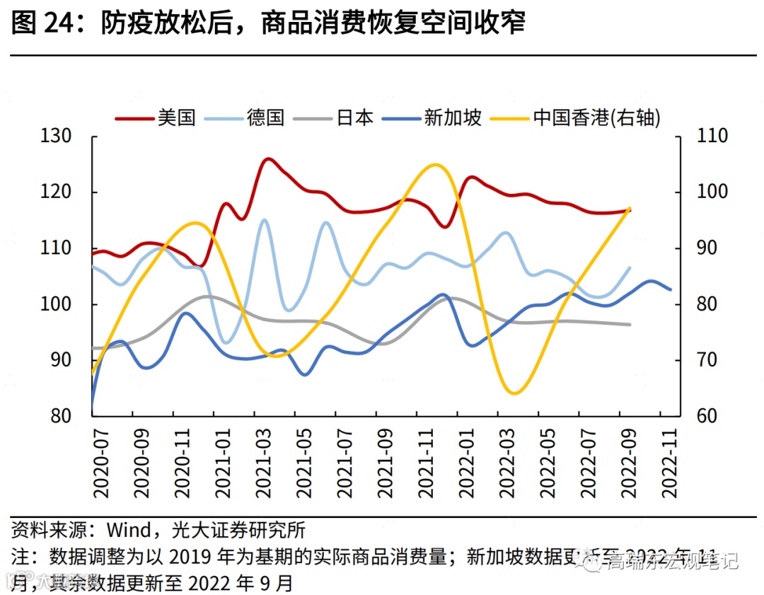 商品消费方面,欧美等国在2022年初防疫放松后,商品消费不升反降;亚洲国家或地区的商品消费在下半年回升后,修复高度也低于2021年末。