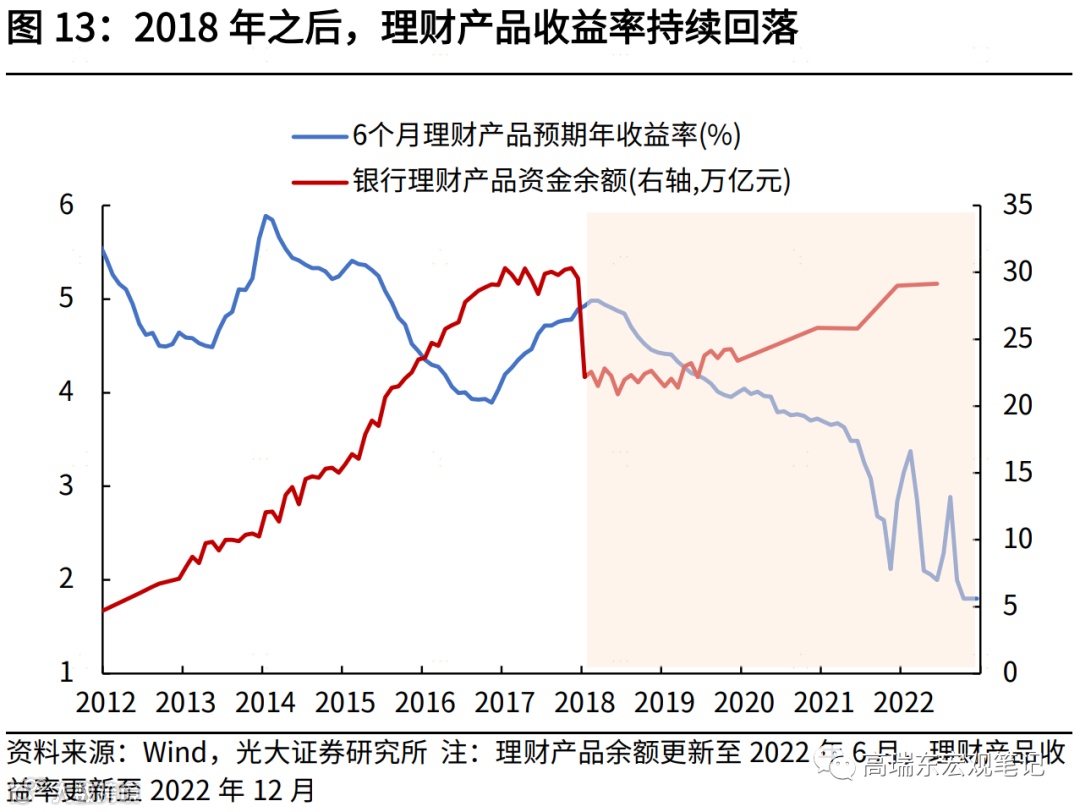 此外,四季度理财净值大幅波动造成的理财产品大规模赎回,也导致居民存款大幅增加。根据益普标准统计,2022年四季度个人理财存续规模为23.7万亿,较三季度下降约1.9万亿,相较一季度下降0.6万亿。理财产品赎回后,资金会存在分流情况,一部分转为银行存款,一部分继续通过货币基金等形式留在金融市场。因此,对居民存款实际影响会低于1.9万亿。
