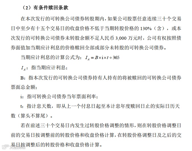 让我们看一个近期发行的可转债中的相关条款,赎回一般会发生在股价大幅上涨的情况下,在市场大幅上扬的情况下,投资者需要关注收益以及转股时机之间的把握,避免造成上市公司行使赎回权导致错过转股的情况。
