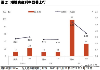 短端资金利率显著上行。临近月末叠加周内税期,资金面适度收紧,周内央行适时加大OMO投放力度,短端资金利率有所上行,利率走廊形态仍维持稳定。截至2月25日,(1)Shibor1D和Shibor7D分别录得2.23%和2.32%,较上周分别上行12pb、22bp。(2)DR001和DR007录得2.21%和2.20%,均较上周上行11bp。(3)GC001和GC007录得3.03%和2.5%,较上周分别上行99bp、34bp。