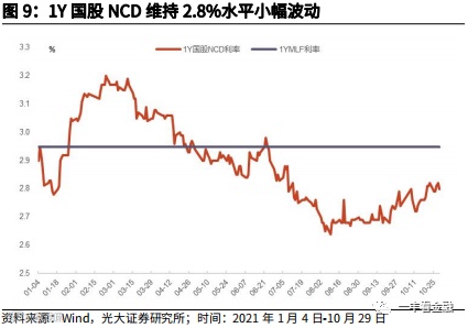 目前,部分银行司库在NCD配置策略上,已要求基本使用完年内的备案额度。截至10月29日,NCD备案剩余额度为5.62,已占全部备案额度的70%左右,2020年国股银行使用比例基本维持在70%,其他中小银行略低一些,若按照全年75%使用比例测算,预计11-12月份月均净融资规模有望维持在4000亿左右,与10月份较为接近,但较2020年11-12月份大幅提升。因此,后续我们可以持续通过高频跟踪NCD净融资,来判断宽信用进程以及信贷投放情况。