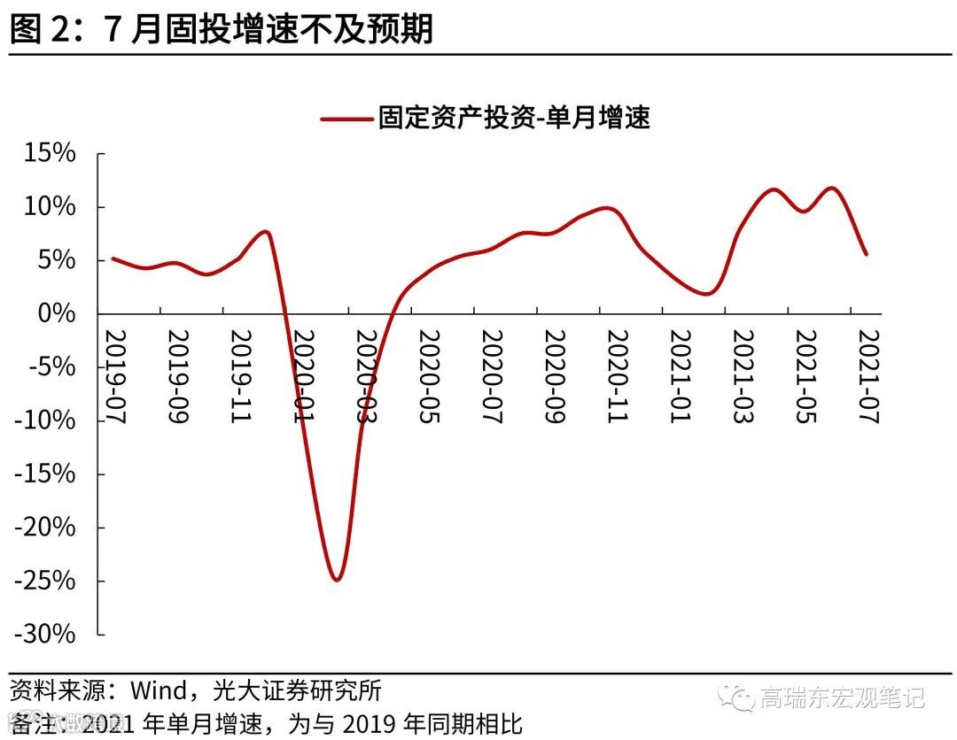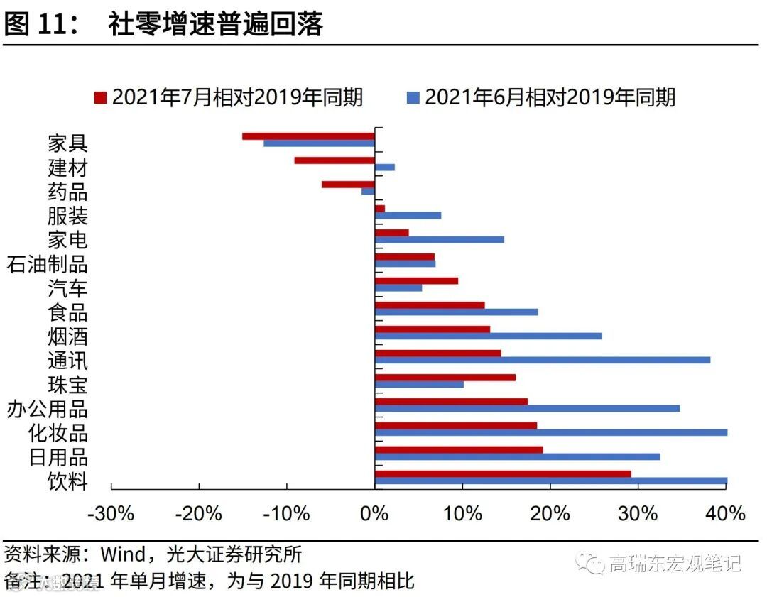 社零大幅低于预期,7月社零环比增速-5.3%,大幅低于历史同期的-1.1%(2016年至2019年)。对社零拖累较大的,主要是居住品类(家具、家电、建材)及可选商品(饮料、化妆品、通讯、办公)。三季度,疫情境外输入的压力尚未减轻,国内疫情防控料将持续收紧,压制居民消费。