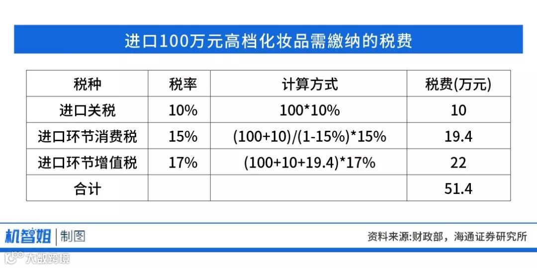 根据海通证券研究所测算,假设海关核定的某批高档化妆品关税完税价格为100万元,按政策规定,其进口关税/进口环节增值税/消费税分别为10%、17%、15%,则其需要缴纳的三种税费合计51.4万元。