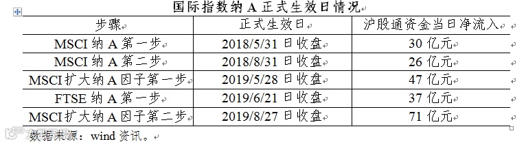 国际知名指数纳入A股是A股配置价值的直观体现,也是推动境外投资者布局A股的重要因素。MSCI明晟指数于2018年5月和8月首次纳A,2019年5月和8月扩大纳A因子至15%。