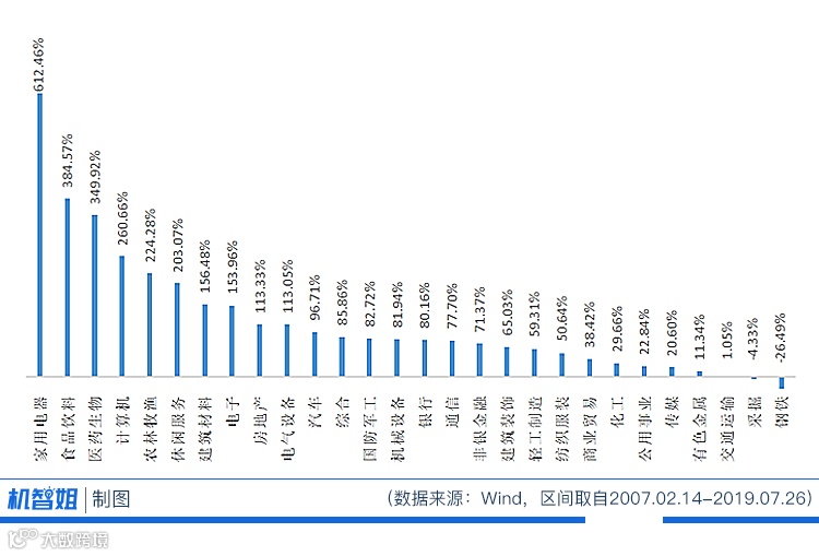据wind数据所示,12年来在申万28个一级行业中,除了采掘和钢铁呈现负收益外,其余行业均是正增长。其中10个涨幅超过100%,家用电器更是以超600%的涨幅位居首位。