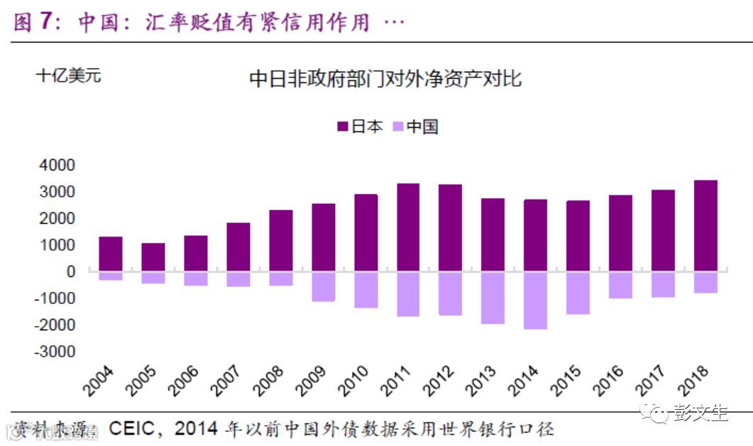 对中国来讲,人民币贬值、美元升值,在金融层面也有紧信用的效果。中国的非政府部门是对外净负债,人民币对美元贬值增加债务人的还本付息负担,紧缩其信用条件(图 7)。非政府部门的美元负债主体主要是房企和国企,所以汇率贬值带来的紧信用作用主要在这两类企业。