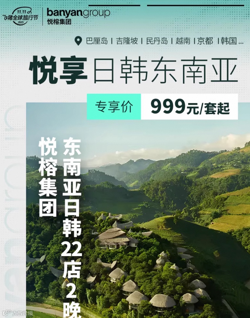 悦榕集团东南亚22店2晚通兑齐上阵!4小时飞行圈!巴厘岛|马来西亚槟城|吉隆坡等任您选!套餐含双早+SPA/正餐/接送等可选!超长有效期至26年4月30日!花呗可囤!不约自动退!